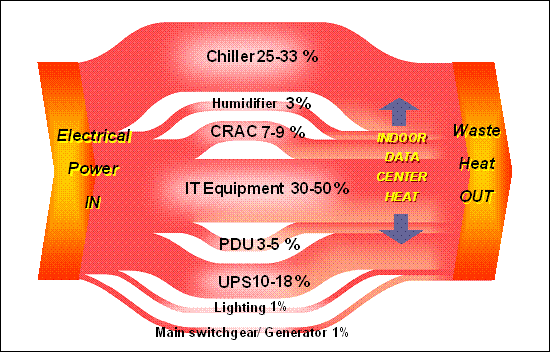 数据中心的电力密度在过去10年间增长了10倍。美国在1992年每机柜2.1千瓦,到了2006年涨到14千瓦;很多企业经常因电力限制而无法充分利用其机柜空间。处理器能力的飞速提高,导致数据中心基础设施电源需求大幅增加,既要用电力来驱动系统的运行,又要用相当的电力来驱动空调,以冷却系统产生的热量。