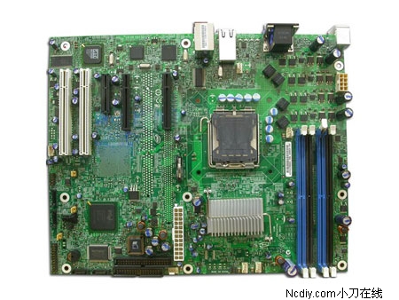 对于服务器主板我们看到的更多的是强悍的做工,在强悍做工的背后,我们其实看到的花哨东西并不多。这块主板同样如此。我们看到的一切都是传统的东西,绿色的PCB板,蓝黑相见的内存插槽。显得非常的大方,朴素。大致的看来,这块主板应该的级别应该是入门级的服务器主板,看不到64位的PCI插槽,看不到SCSI接口。要的都是够用就好的设计。支持的CPU为一颗LGA 775至强或者是LGA 775的P4。支持的电源接口为24针接口。