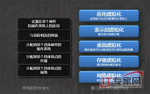 从上图不难看出,企业IT架构动态化,成为企业追逐的目标,目前虚拟化已经被寄予很大希望来解决这些难题,从而提高企业的 IT 操作效率并增强他们对变化的条件的响应能力。虚拟化最初侧重于整合数据中心内的资源,而现在已经可以跨越IT架构实现应用程序虚拟化,进而降低成本和提高灵活性。