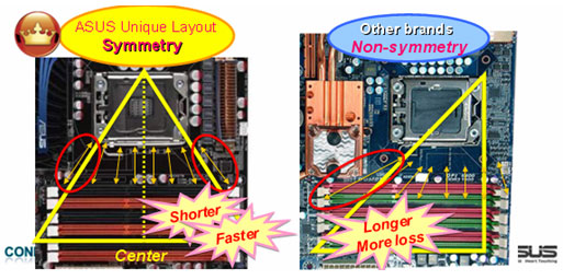 在P6T Deluxe主板上,我们还见到了全新的主板技术Unique Layout。从下图可以看出,一般主板上,一般主板从CPU到内存两端的传输距离不对等,造成传输数据的不匹配,影响了数据的传输效率和信号的纯净性。华硕的PCB设计人员,颠覆了传统的设计思路,克服了PCB设计上的困难,重新设计了处理器的位置,从而解决了这一难题。