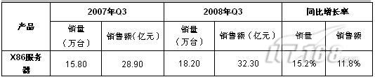 表1 2008年第三季度x86服务器市场规模与增长