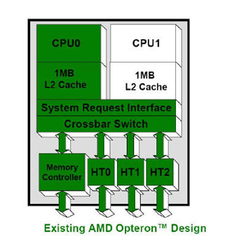 AMD双核产品的架构在单核的时代就已经做了充分的考虑,AMD Opteron核心内部拥有三个Hyper Transport总线控制单元,分别用于处理其与北桥芯片、PCI-X控制器和其它处理器的连接,这个与其它处理器的连接指的就是多处理器技术。