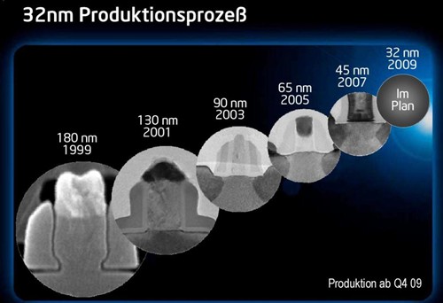 此外,按照IntelTick-Tock的钟摆路线,2008年成功的将Tock架构革新为Nhalem,而到了2009年在全球经济形势不太好的前提下,Intel仍然坚持将自己得产品进行更新,即在今年的第四季度将投产32nm工艺处理器。但很有可能32nm处理器要延期到2010年才会正式发布。