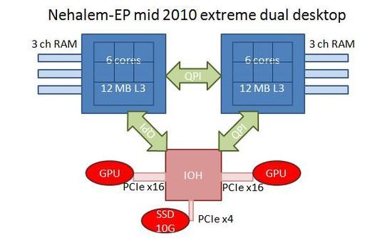 因此,我们可能容易被昂贵、庞大又抢手的Nehalem-EX桌面或工作站版所迷惑。除了被EDA芯片设计和仿真过的巨大内存容量外,该芯片还具有比Nehalem-EP大的多SMP以及I/O吞吐能力:更多的内存通道,以及额外的为快速的链接和与CPU间传讯的QPI总线数量,更多的I/O通道可以同时为两个CPU提供无限的PCIe的扩展能力。下面我们看图解说一下。