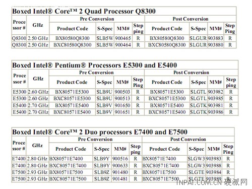 举例说,旧的不支持VT技术的酷睿2双核E7400处理器S-Spec为SLB9Y,而新推出的S-Spec为SLGW3的酷睿2双核E7400则支持VT技术。用户在选购的时候需要注意这个区别,我们在上表中可以看到不支持VT技术和支持VT技术的相应产品S-Spec号。