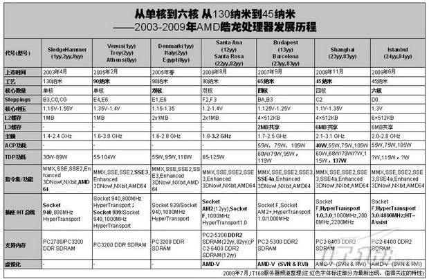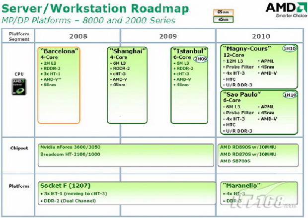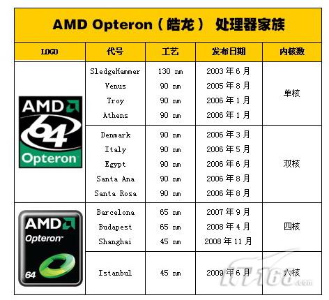 按计划,2010年,AMD将会发布代号Sao Paolo的六核皓龙和代号Magny-Cours的12核心产品,后者使用MCM(Multi-Chip Module)芯片封装技术,使用Socket G34接口。此外,到2011年,AMD的服务器处理器产品线还会使用新的内核Bulldozer(4核,32纳米),支持SSE5指令集,从而可以获得更好的HPC性能。