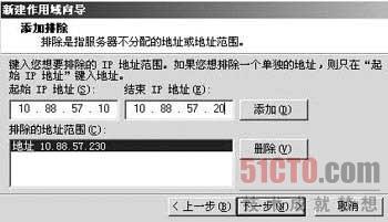 4. 在图2所示的窗口中,输入需要排除的IP地址范围。由于校园网络中有很多网络设备需要指定静态IP地址(即固定的IP地址),如服务器、交换机、路由器等,此时必须把这些已经分配的IP地址从DHCP服务器的IP地址范围中排除,否则会引起IP地址的冲突,导致网络故障。