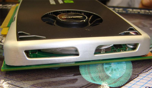 供电方面,Quadro FX1800采用核心与显存分离式供电,分离式供电能有效阻隔电路间的电磁干扰,保证显卡的稳定性;用料上也都是选择了日系固态电容及陶瓷贴片电感,搭配上高品质的MOS管,另外通过散热器的缝隙我们在这款产品上看到了多块造价昂贵的钽电容,对于显卡长期工作下的稳定性提供了更为良好的硬件基础。