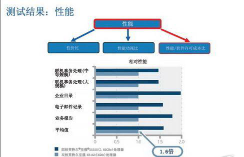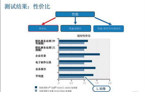 Sudip Chahal认为,性价比、性能功耗比和性能软件许可成本比是影响总体拥有成本(TCO)的三大主要因素。通过测试,相对于内置英特尔双核处理器的服务器,内置四核英特尔至强X5355处理器的服务器可以提升性能高达60%,提升性价比高达32%,提升性能功耗比高达20%,分别如下图所示。