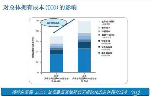 Sudip Chahal还谈到,假设数据中心的TCO由服务器资产成本、软件许可成本、数据中心建造、数据中心设施、数据中心布线、局域网(LAN)连接、存储区域网(SAN)、系统支持员工数等因素构成。通过测试,在托管相同数量虚拟机的情况下,相比内置双核至强5160 3.0 GHz处理器的服务器,内置四核英特尔至强X5355 2.66 GHz处理器的服务器最多可降低30%的总体拥有成本。