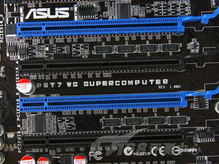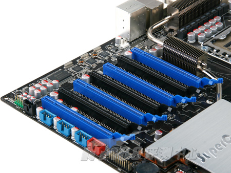 本次我们介绍的华硕P6T7 WS SuperComputer主板就是采用了这种解决方案,由于单颗nForce200 SLI芯片提供了32个PCI-E通道,两个SLI芯片一共就是64个通道,加上X58芯片组自带的32通道,这样算下来P6T7 WS SuperComputer主板的通道数量达到了96个,可谓彪悍。