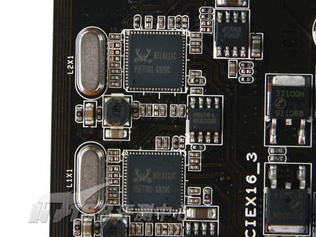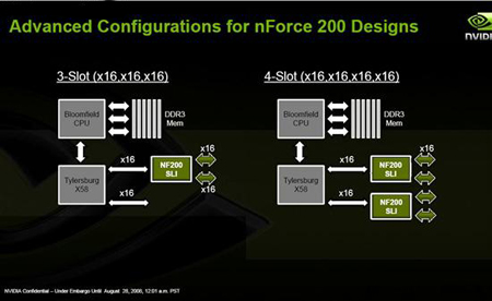 另外一种方法就比较费劲了,这就是通过采用NVIDIA nForce200 SLI桥接芯片。使用SLI桥接芯片的好处是可以提供更多的PCI-E x16通道,不占用X58芯片组本身提供的通道。不过缺点也很明显,使用SLI桥接芯片需要更多的成本投入,单颗nForce200 SLI芯片的价格约为30美元,这样主板的成本和售价都会很高。