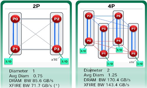 具体到内部每个核心的连接,在2P配置条件下,灰色粗线代表的16bitHT接口将连接邻近的核心,而灰色细线代表的8bit HT接口则用与连接处与对角位置的两个核心,这意味着在Magny-Cours组成的2P系统中处理器封装内的每个核心都可以通过HT接口连接在一起。