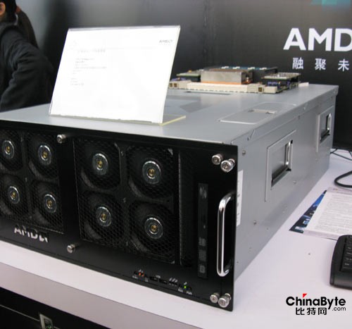 AMD还展出了基于4路12核Magny-Cours芯片的服务器工程样机,采用了全新的AMD芯片组,12核处理器有12M的L3缓存,四通道U/RDDR3$LV RDDR3内存控制器。不过当时展出的机器并未插满四个插槽,AMD中国区服务器与工作站产品经理梁宏伟先生介绍称,基于这台机器做了两个虚拟机,其中一个虚拟机运行的是Windows Server 2008 R2。