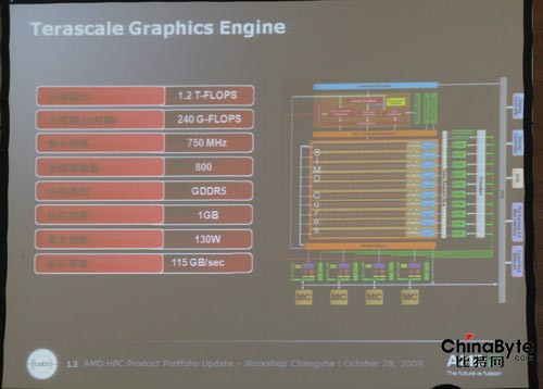 他的PPT中展示了ATI Radeon HD 5870的图形芯片,被称之为世界上性能最强劲的GPU,计算能力达到了2.72TFLOPS,刘文卓称,GPU的计算能力是与CPU竞争的主要因素。