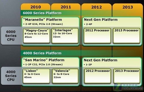 而面向更加关注能效和成本优化的用户,在2010年第二季度,AMD将很快跟进,推出面向单路、双路服务器市场的“SanMarino/Adelaide”平台,该平台基于代号“Lisbon”的皓龙4000系列处理器,具有4个或6个核心,采用C32接口,具有2条DDR3内存通道,具有低能耗和成本优化特性。