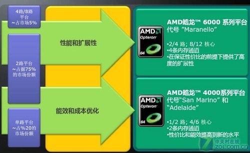面向高端的4路、8路服务器市场,AMD在2010年第一季度将推出全新的“Maranello”平台,该平台采用了代号为“Magny-Cours”的全世界首款8核心和12核心的皓龙6000系列处理器,采用G34接口,支持4条DDR3内存通道,适合追求高性能和高扩展性的用户,能够满足企业和主流计算苛刻的数据密集型工作负载,并具有先进的虚拟化和能源效率的特点。