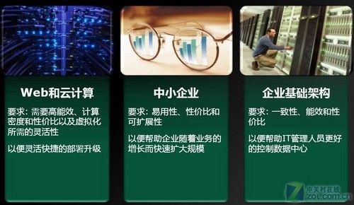 明年推出的皓龙4000平台具有低功耗、低成本和高能效的特点,据Gina介绍,皓龙4000平台的主打市场有三个部分:第一部分是Web和云计算,这部分市场需要非常低的功耗、需要高密度计算并看重高产品价值。第二部分市场是中小企业,要求易用性和高性价比。随着中小企业的不断成长,平台要有非常好的可扩展性。第三部分则面向企业基础架构市场,这类客户看重的是一致性、能效和高性价比,并且能帮助企业IT人员更好地管理和控制数据中心。