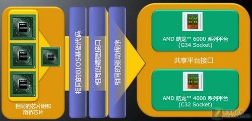 另外,在兼容性上,皓龙6000和G34接口将兼容皓龙4000的C32,两个新的平台具有相同的芯片组和南桥芯片,相同的BIOS基础代码和编程接口,相同的驱动程序。对OEM客户来说,这使得他们的设计和验证支持更加容易,便于客户管理和维护系统。