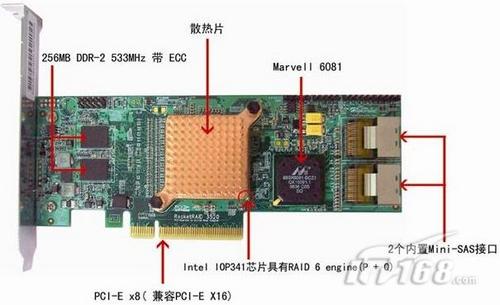 以RocketRAID 3520卡(参考价格3800元)为例,其是HighPoint新推出的一款PCI-E X8的产品,是RocketRAID 3000系列的新成员。它有两个内置Mini-SAS接口,可以连接8块SATA II硬盘(兼容SATA一代磁盘),此款产品是HighPoint针对中、高端存储市场需求开发推出,带有256MB DDR2缓存,支持的功能包括在线扩容(Online Capacity Expansion,OCE)和在线RAID 迁移(Online RAID Level Migration,ORLM),可以快速和背景初始化以方便RAID立刻投入使用;采用Intel架构的IOP341处理器,以绝对的运算优势超越同等八盘位RAID卡,使RAID6、RAID5有各自单独的处理单元,大幅度提升写性能,适用于非编存储系统、硬盘备份、NAS存储系统、视频编辑和近线存储系统等行业用户。