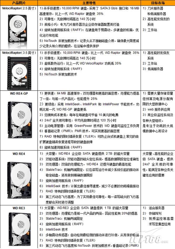 WD企业级硬盘分为三类,按厂商的划分方式为:高性能(WD VelociRaptor猛禽系列)、业务关键型(WD RE4, WD RE3)、节能型(WD RE4-GP)。如下图: