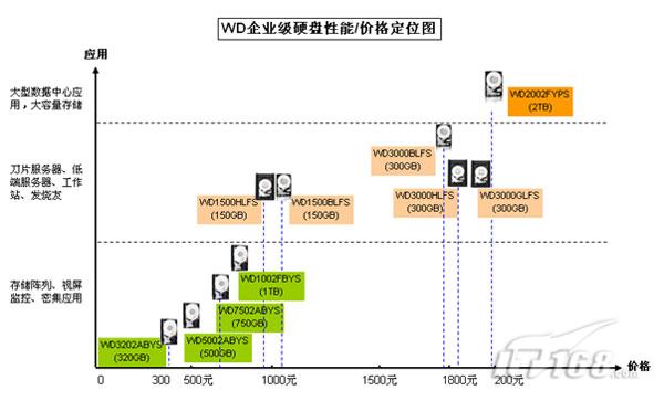 下表,对WD硬盘所对应市场和价格进行了定位,可以看出每款产品所在图形中的位置。
