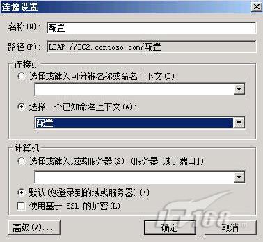 3. 右击【ADSI编辑器】,在弹出的连接设置中,连接点在【选择一个已知命名上下文】里选择【配置】,确定。如图2