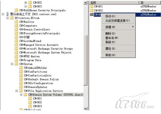 7. 依次展开【默认命名上下文】-【CN=SYSTEM】-【CN=File ReplicationService】-【CN=Domain System Volume(SYSVOL share)】-【CN=DC3】,其中DC3为需要删除的域控制器。