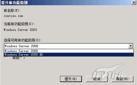 1. 打开【Active Directory 域和信任关系】,右击【contoso.com】,选择【提升域功能级别】,在弹出的对话框内选择【Windows Server 2008 R2】即可。如图5