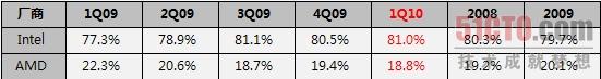 厂商方面,Intel目前的总体份额为81.0%,环比增长0.5个百分点,同比大幅提高3.0个百分点,而AMD从去年同期的22.3%和上季度的19.4%下跌到了18.8%,另外VIA占据0.2%。
