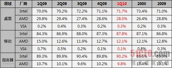 Intel在桌面、移动、服务器三大领域的份额分别为71.7%、87.8%和90.2%,都有不同程度的提升,而AMD占据着28.0%、12.1%、9.8%,份额略有下滑。