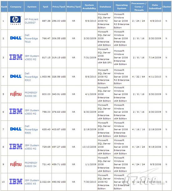 TPC-E:采用 AMD 皓龙 6176 SE 处理器并运行 Microsoft SQL Server R2 和 Microsoft Windows Server 2008 R2 的 HP ProLiant DL385 G7 得分为 296.00 美元/tpsE,排名第一。