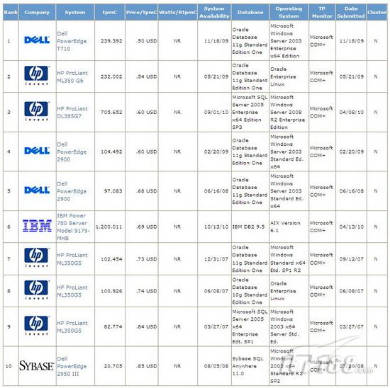 TPC-C:采用 AMD 皓龙 6176 SE 处理器并运行 Microsoft SQL Server 2005 和 Microsoft Windows Server 2008 R2 的 HP ProLiant DL385 G7 服务器得分为 0.60 美元/tpmC,排名第三。