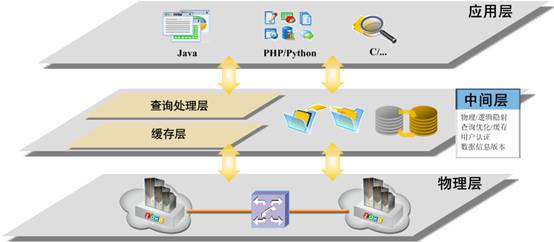 应用程序首先会定义中间层逻辑的模式,逻辑模式对所有应用是统一的。中间层会将应用程序的查询从逻辑模式翻译成存储所用的物理逻辑,物理存储逻辑可以是一些对象存储逻辑。应用程序不关心这些存储逻辑,由中间层负责和存储逻辑交互。中间层会为应用提供缓存,甚至会提供数据的版本信息,逻辑模式和物理模式的映射表,物理查询的优化,应用程序的用户认证等等。