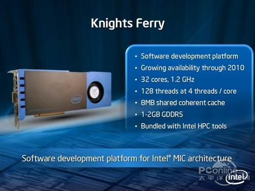 提起GPGPU,通常人们首先会想到NVIDIA或AMD的相关产品,自英特尔的Larrabee项目停滞后,英特尔于2010年5月31日在ISC国际计算大会上宣布了MIC众核架构产品“Knights corner”。与此对应的是,还提到了开发工具“Knights Ferry”。其中Knights corner就是传统意义上的硬件产品如Tesla,而Knights Ferry就是类似NVIDIA CUDA这种用来编程的架构。