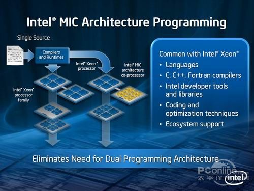 在传统GPGPU的编程环境下,大多数程序需要重新设计。这也是GPGPU并行计算效率较低的主要原因。英特尔表示对于MIC架构的Knights家族会为用户提供完整的产品以及软件工具。同时强调,用户通过Knights Ferry所面对的编程环境将是一个统一的多核X86系统,而不需要去定义CPU做什么,协处理器做什么。这些都将通过编译器自动选择更有执行效率的方式指定给CPU或者Knights协处理器。