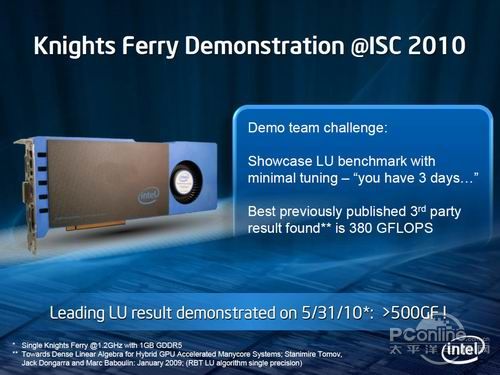 关于Knights的现阶段性能,据Rajeeb Hazra先生介绍,在5月31日举行的ISC2010超算大会上,运算同一个Demo,某友商的GPGPU系统运算能力是380GFlops,而英特尔的MIC架构则达到了500GFlops。