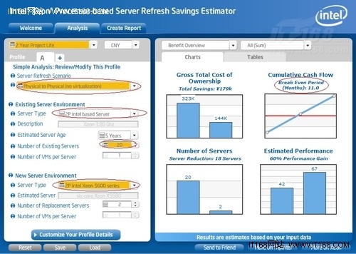 下面是英特尔提供的一个小工具,用于评估服务器更新投资回报率,也欢迎感兴趣的朋友使用这个来测算一下自身的服务器更新之后的成本和回报问题。(点这里)