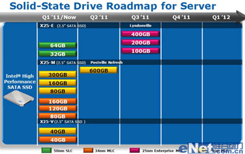 今年的第一季度(包括现在),英特尔将会发布面向价格市场的40GB X25-V固态硬盘,以及面向主流市场、容量为80GB、160GB和300GB的X25-M固态硬盘,以上这些产品都是基于25纳米的MLC技术。另外,采用25纳米芯片制造的、容量高达600GB的SSD产品将于今年第二季度推出。紧接着,今年第三季度英特尔将会推出企业级SSD产品X25-E,这一系列产品具有100GB、200GB和400GB三种容量规格。这些代号为Lyndonville的SSD产品将采用25纳米企业级的MLC存储芯片。